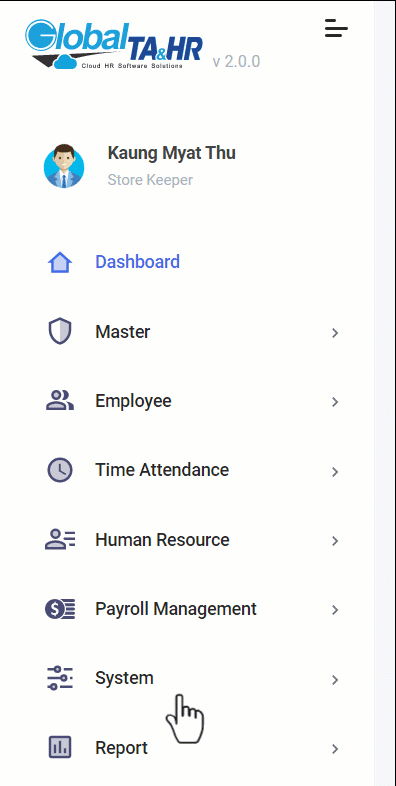 User Level : System အားအသုံးပြုမည်ဆိုပါက User Level တစ်ခု မဖြစ်မနေ သတ်မှတ်ရမည်ဖြစ်ပါသည်။ ချိတ်ဆက်ထားသော User Level ပေါ်မူတည်ပြီး ခွင့်ပြုထားသော Menu များ၊ ရွေးချယ်ထားသော employee များကို ကြည့်ရှု စီမံခန့်ခွဲနိုင်မည်ဖြစ်ပါသည်။ User Level အသုံးပြုနည်းကို လေ့လာရန် reference: https://www.globalhr.com.mm/support/userlevelcontrol/