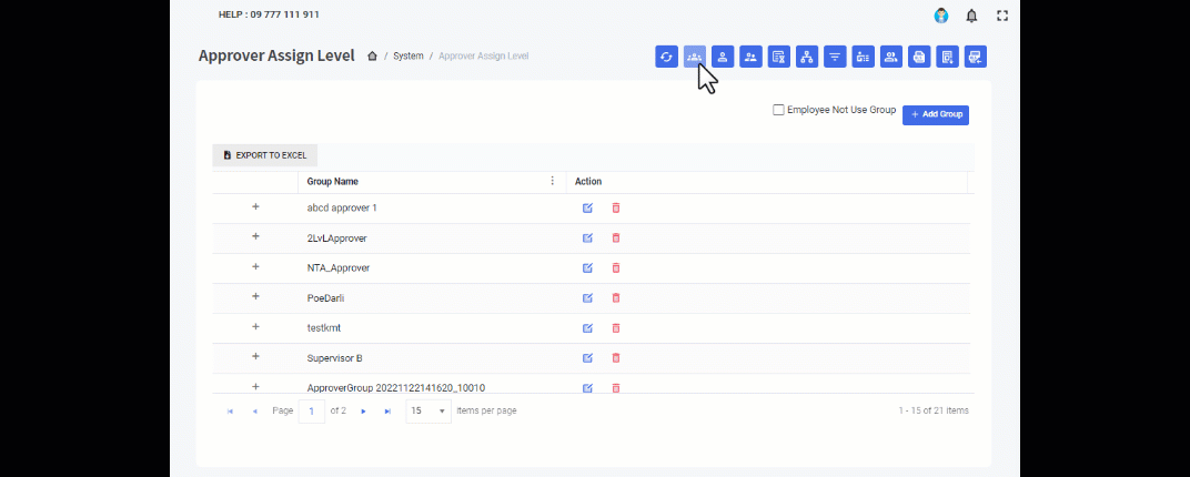 Export Excel : Organization Tree, Filter by Employee, Filter by Multilevel Approver, Filter by Group ဆိုတာများမှ ရွေးချယ် ထားသည့် data များကို Approver Assign Level ဆိုသည့် excel file ထုတ်ပေးမည်ဖြစ်ပြီး ထို Excel တွင် ၀န်ထမ်းများနှင့် Approver Group Name များ ထို၀န်ထမ်းများကို Approve ပေးမည့် Approverများကို အဆင့်လိုက် ဖော်ပြထားပါသည်။
