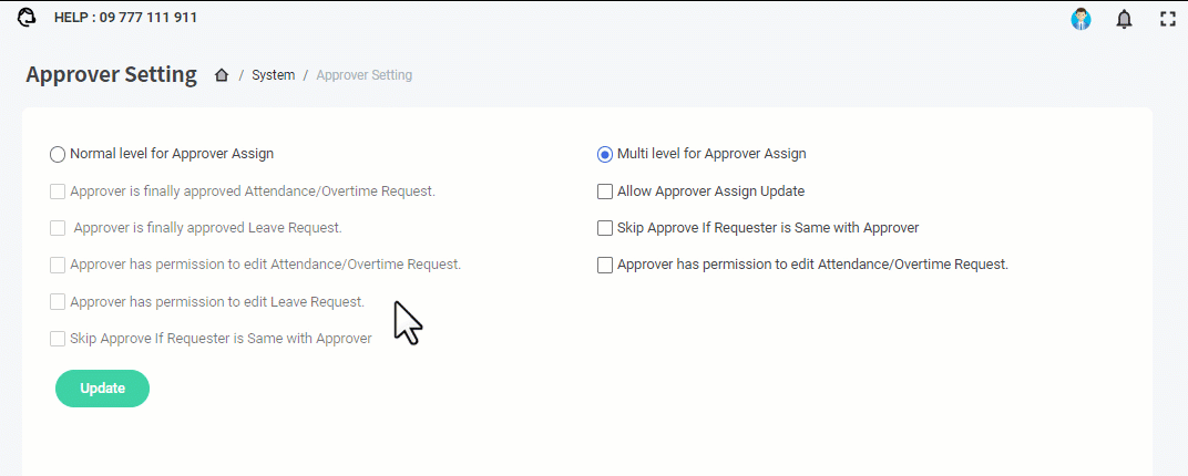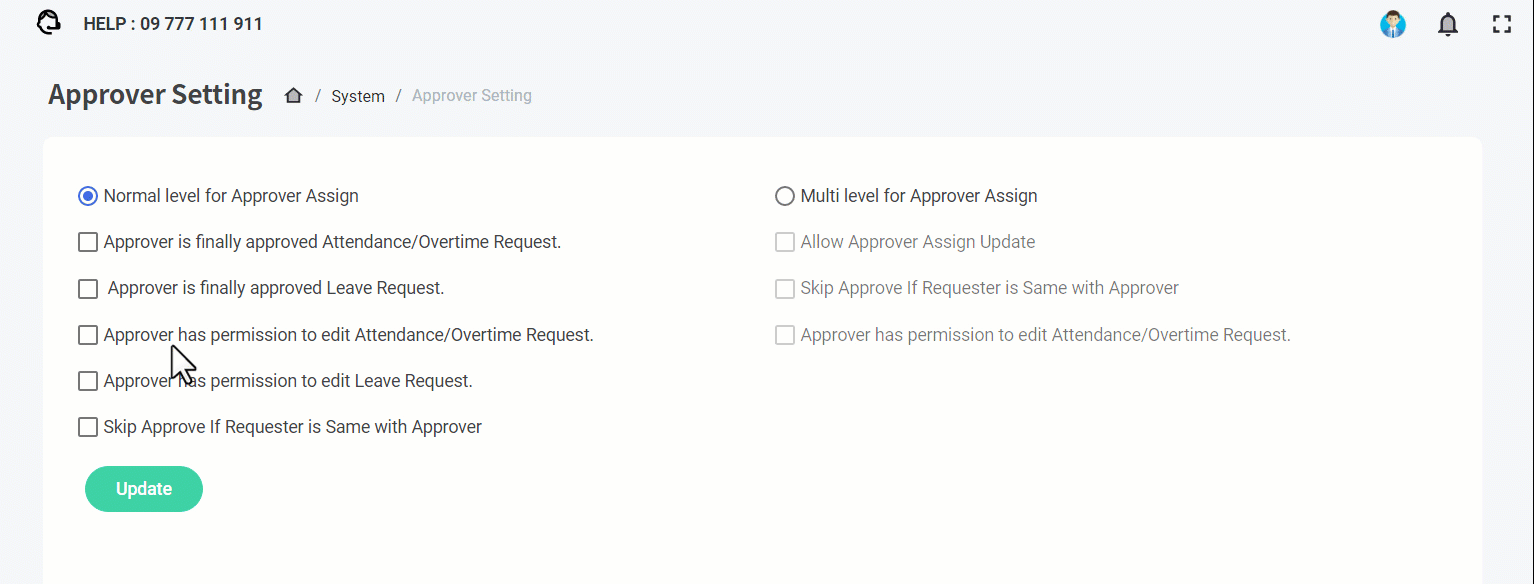 Approver Setting တွင် Normal Level နှင့် Multi Level ဆိုပြီး Approve type (2) မျိုး ရှိပါသည်။