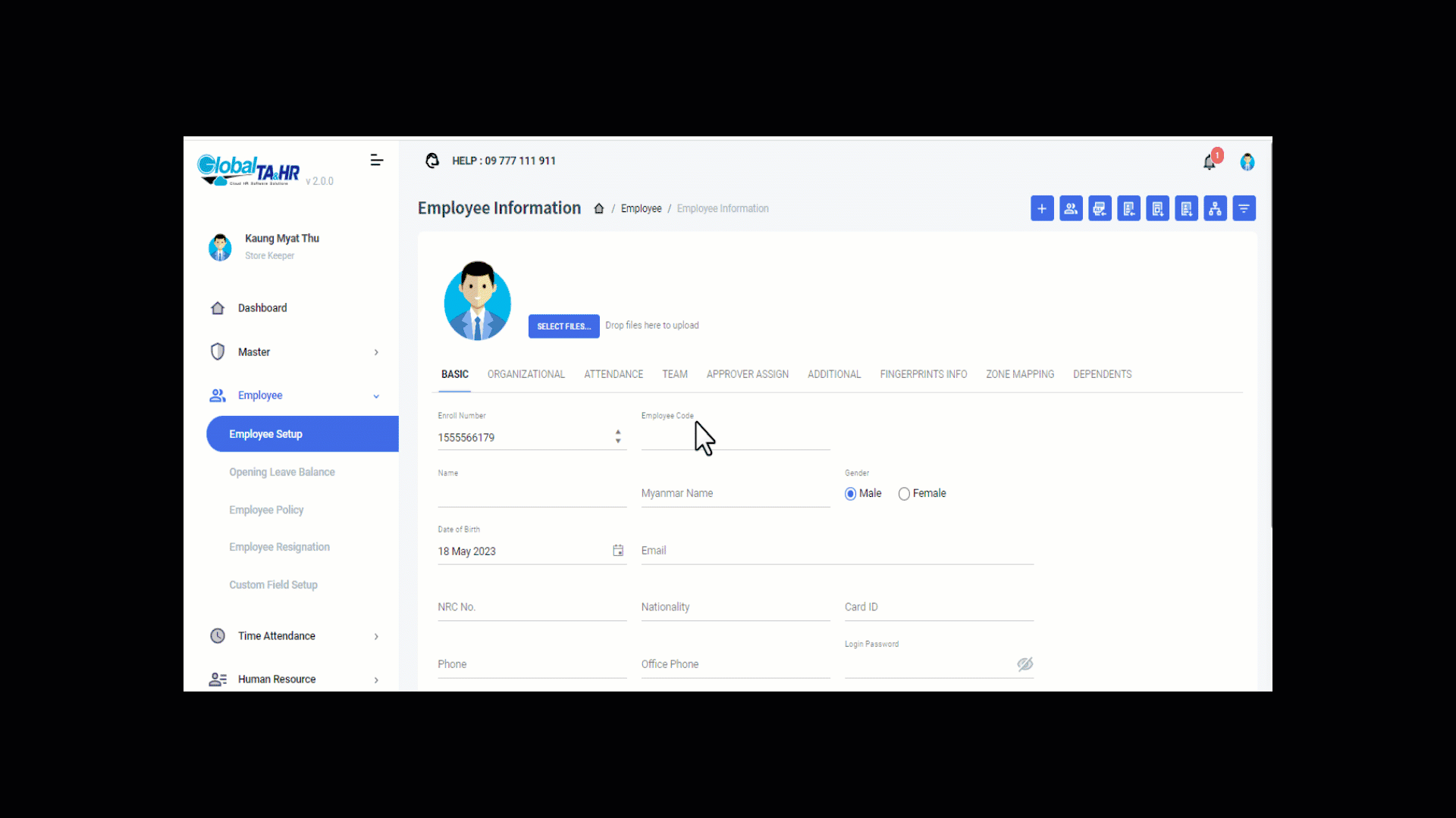 Software သို့ ၀င်ရောက်နိုင်မည့် ၀န်ထမ်းကုတ်(Employee code) တစ်ခုကို မဖြစ်မနေ သတ်မှတ်ရန် လိုအပ်ပြီး Enroll Number အတိုင်း သုံးလို့ရနိုင်သလို မိမိ တို့ စိတ်ကြိုက် English Alphabet (A,B,C,D,E,F,..etc) များနှင့် တွဲသုံးလို့ရပါသည်။