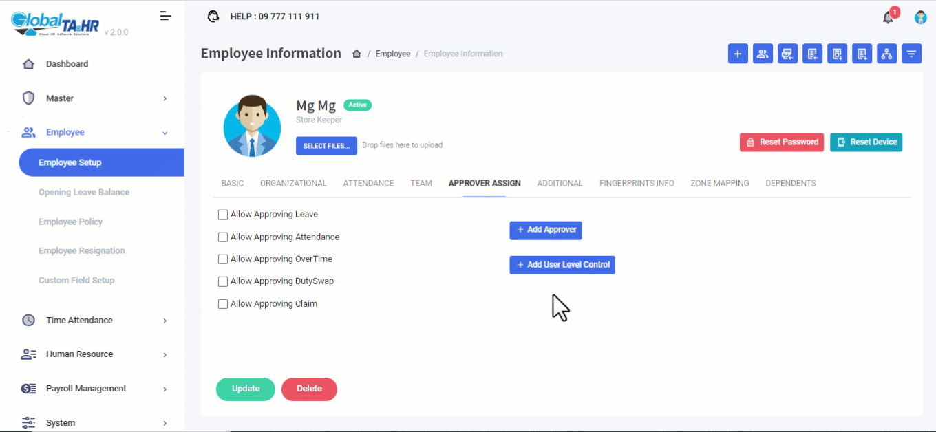 (Tip: User Level အကြောင်းအသေးစိတ်သိရှိလိုပါက https://www.globalhr.com.mm/support/userlevelcontrol/ တွင် ၀င်ရောက် လေ့လာနိူင်ပါသည်။)