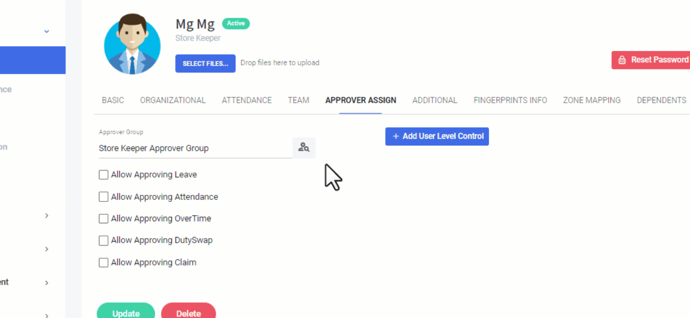 + Add User Level Control ဆိုသည်မှာ Software System တွင် အသစ်ထည့်လိုက်သော ၀န်ထမ်း ၏ အလုပ်ရုံးတက်ချိန်များ(Attendance, Leave, OT)/ ကိုယ်ရေးကိုယ်တာအချက်အလက်များ(People directory) / အတည်ပြုခြင်းဆိုင်ရာ လုပ်ဆောင်သည့် ကိစ္စများ(Approve) ကို ကြည့်ရှု ပြင်ဆင် အတည်ပြုနိူင်သူများ(Approver, Supervisor,Manager,CEO., etc..)၏ Software system အသုံးပြုခွင့် User Level Role Name များကို ရွေးချယ်လို့ ရမည်ဖြစ်ပါသည်။