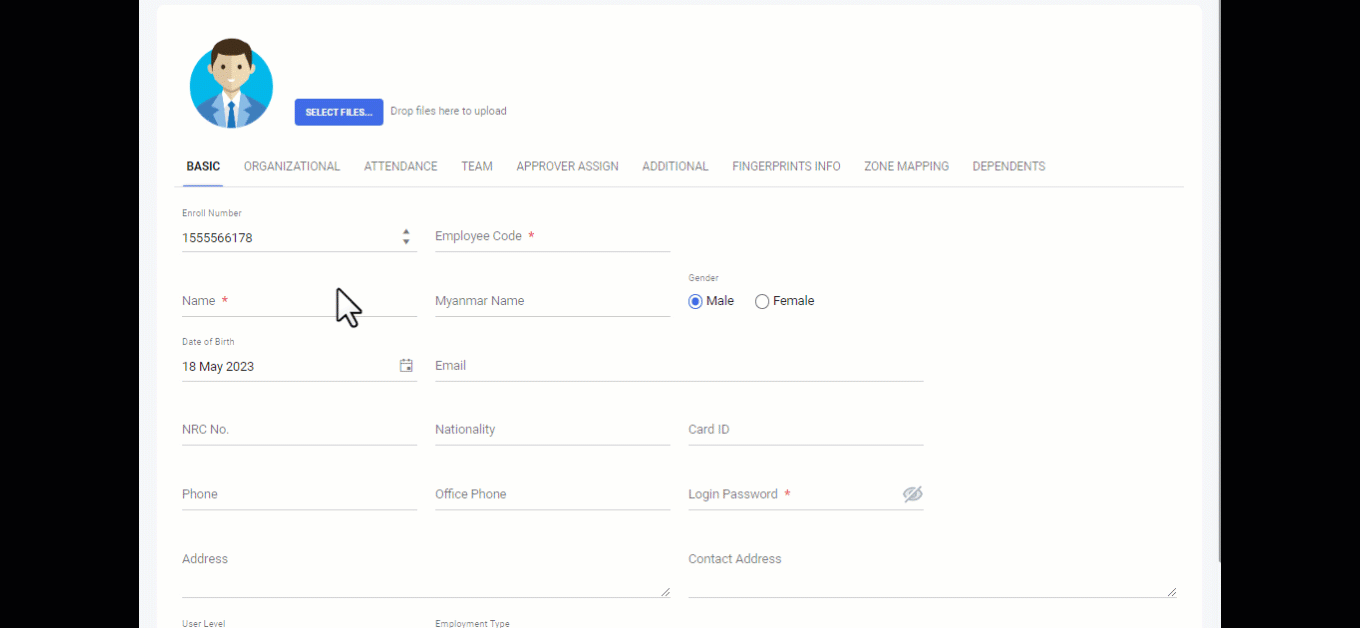 Software System တွင် မဖြစ်မနေလိုအပ်သည့် ခေါင်းစဥ်များဖြစ်သည့် Employee Code, Name, Login Password, User Level, DOB, DOE များကို သတ်မှတ် လိုက်ပါက Software system ရှိ Attendanceပိုင်းနှင့် သက်ဆိုင်သည် Function များကိုတော့ ၀င်ရောက် အသုံးပြုလို့ ရနိုင်မည်ဖြစ်ပါသည်။