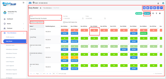 - Select the time period for which you want to view or assign duty rosters (e.g., Today, This Week, This Month, Custom).