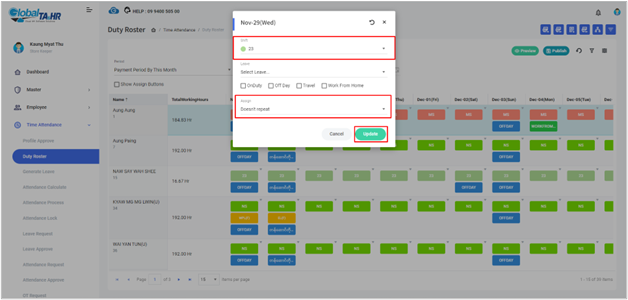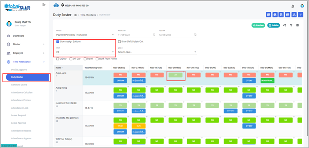 - Click on the Shift Short Code Name box under the date to assign the duty.
