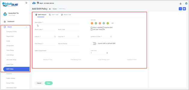 - Create a New Shift Policy: