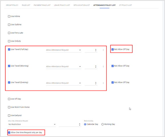 - Attendance နှင့်ဆိုင်သည့် Request – တောင်းဆိုချက်များကို Restrict – ကန့်သတ်ထားနိုင်ခြင်းများ။