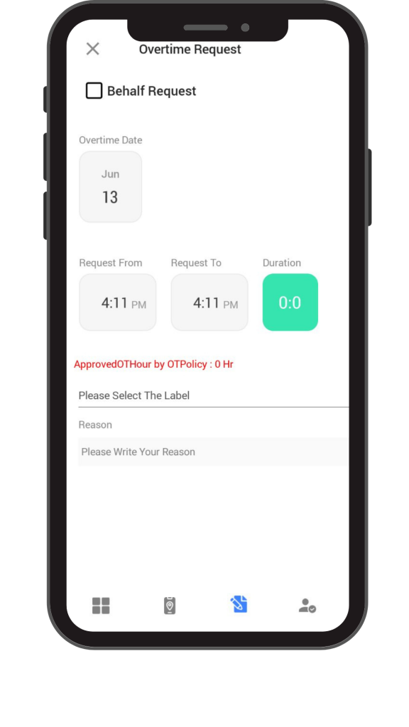 Mobile- မိုဘိုင်ဖုန်းမှ request တင်သော အချိန်မှန်သမျှကို OT တွက်ပါမည်။