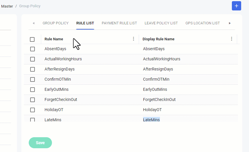 Payment Rule List: အလားတူ Payroll – လစာ နှင့် ဆိုင်သော သတ်မှတ်ချက်များကို လည်း အမည်တစ်ခုစီနှင့် အတန်းလိုက် ရွေးချယ် ရမည်ဖြစ်ပါသည်။ထို သတ်မှတ်ချက် အမည်များသည် အသုံးပြုသူ လုပ်ငန်းအဖွဲ့အစည်း၏ Payroll Policy များပေါ် မူတည်ပြီး ဖော်ပြပေးထားမည် ဖြစ်ပါသည်။