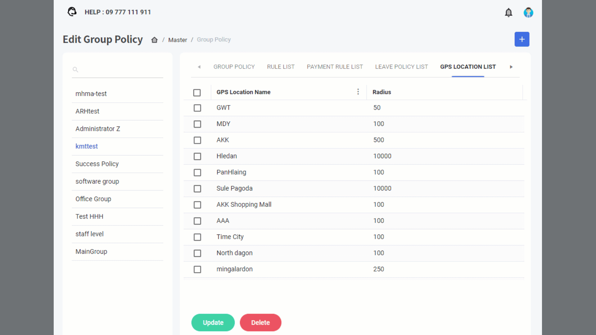 Master >> GPS Location မှာ ဆောက်ထားသည့် Location နာမည်များကို ဖော်ပြပေးမည် ဖြစ်ပါသည်။ ထို Location များသည် Mobile Apps မှ Check IN/OUT အတွက် သတ်မှတ်ထားခြင်းဖြစ်ပါသည်။ ထိုနေရာများ ကို ရွေးချယ်ပြီး တခါတည်း Policy တွင် သတ်မှတ်လို့ရနိုင်ပါသည်။