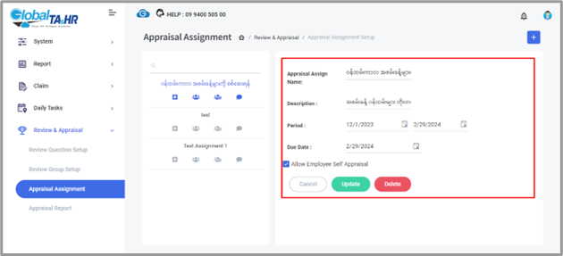 Appraisal Assignment ဆိုတာတွင် မိမိသတ်မှတ်ချင်သည် Appraisal အတွက် Assignment တစ်ခု အမည်ပေးကာ ထို Assignment နှင့် သက်ဆိုင်သည့် မေးခွန်းများ တွဲထားသော Review Group များ ကို ထည့်ပေးနိုင်ခြင်း၊ Review ပေးမည့်သူတွေကို အဆင့်ဆင့် သတ်မှတ်နိုင်ခြင်း၊ Reviewer တွေနှင့် Review Group တွေကို သတ်မှတ်နိုင်ခြင်း၊ Review ခံရမည့် ၀န်ထမ်းများကို သတ်မှတ်ခြင်း၊ မှတ်ချက်ပေးမည့်သူများ(Commenter) ကိုပါ သတ်မှတ်နိုင်ခြင်း စသည့်လုပ်ဆောင်ချက်များကို ကာလ (Period) သတ်မှတ်၍ နောက်ဆုံး ဘယ်နေ့အထိ (Due Date) Review လုပ်မည်ဆိုတာ အပြင် ၀န်ထမ်းကိုယ်တိုင် ပြန်ပြီး self -appraisal လုပ်နိုင်သည့် option ကို ပါ ရွေးချယ်သတ်မှတ်နိုင်ပါသည်။